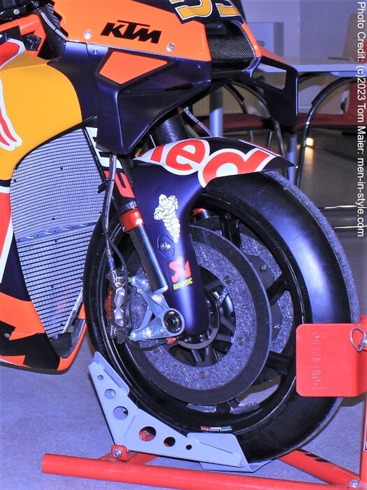 Bremsen ist genauso wichtig wie Beschleunigung: An den Bremsen sind Scheibe und Beläge aus Kohlefaser-Material (=geringes Gewicht). Und man versucht immer individuell je Strecke aus den 5 verschiedenen Varianten die passende einzusetzen, z.B. auf dem Sachsen-Ring setzt man die „Kleinen“ 320 mm-Durchmesser ein, und in Spielberg die größten, mit 355 mm-Durchmesser ein, da dort die größte Beanspruchung stattfindet.