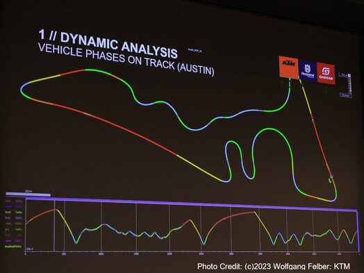 Im aktuellen Entwicklungsprozess wird immer bereits am Motorrad für die kommende Rennsaison gearbeitet. Aus Erfahrung hat es sich bewährt, möglichst frühzeitig die Gelegenheit zu nutzten, und unter realen Renn-Bedingungen zu testen. Darum haben die Hersteller 3x im Jahr die Gelegenheit, dass ein Testfahrer (bei KTM aktuell: Daniel Petrosa) mit einer Wild-Card am Rennen teilnimmt: „Track-testen ist deswegen die „Letzte Instanz“, weil im Endeffekt - mit den ganzen Simulationen, Berechnungen, Zahlen, hin und her, kann man eigentlich oft tolle Werte haben - aber im Endeffekt geht es darum, dass der Fahrer ein Gefühl hat auf seinem Bike; dass sie trotz des irren Speeds, den er fährt, sich safe fühlt; wenn er am oberen Ende und sich ganz am Limit bewegt - das Motorrad trotzdem noch kontrollieren kann - dies ist eigentlich etwas, was man am Rechner nicht darstellen kann.“