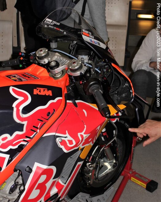 Wie Wolfgang Felber den Zuhörern erklärt, ist es auch im fortgeschrittenen Computer-Zeitalter nicht möglich alle Fahr-Situationen zu berechnen und die Luftströmungsfelder zu simulieren - da sich das Motorrad ständig „…wie ein Kampfflieger bewegt“, (Schräglagen bis 62° und Pitch (Vorderrad-Eintauch-Bewegung) +/-10°). Ein weiteres Feintuning der Aero auch im Hinblick auf Geräusche und Turbulenzen erfolgt im Strömungskanal des KTM-Windtunnels anhand vom Motorrad-Clay-Prototyp, einschließlich mit aufgesetztem individuell-nachgebildeten Fahrer-Dummy-Modell. Die Potenziale zur Verbesserung liegen hier an der Verkleidung, den Flügeln und Kühlkanälen - oft sind die Änderungen im minimalen, wenige Millimeter-Bereich – jedoch mit großen Auswirkungen. Wichtig – dieses Aero-„Maßanzug“-Paket muss zum Saisonbeginn für jeden Fahrer homologiert werden!